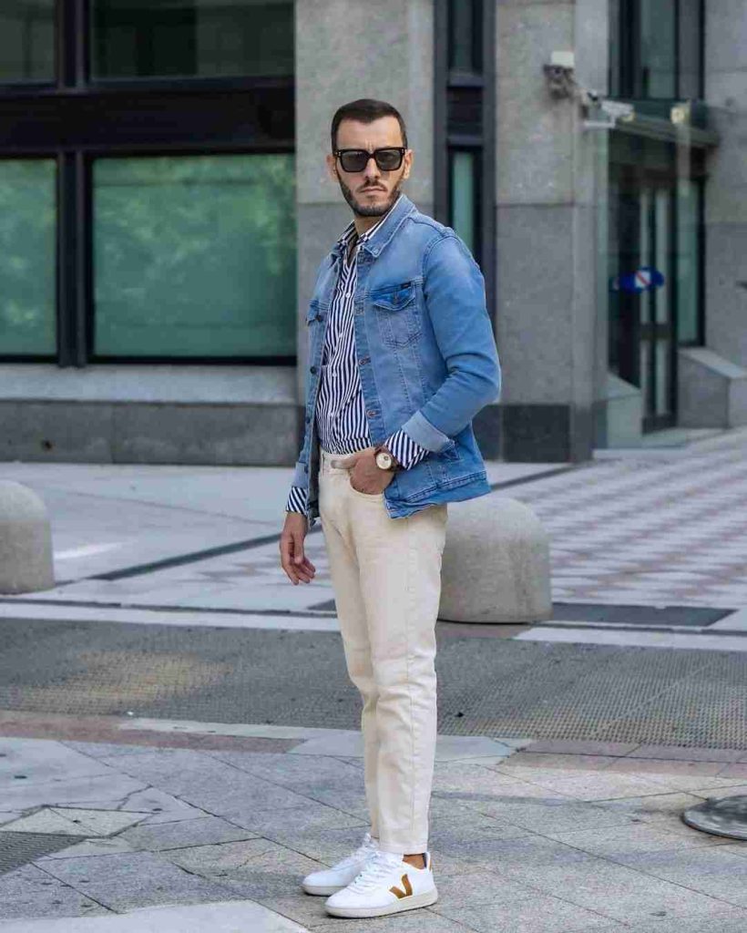 A light denim jacket over a striped button-down shirt looks relaxed but styled. With cream trousers and white sneakers, it becomes a smart casual men summer outfit that feels fresh for weekends.