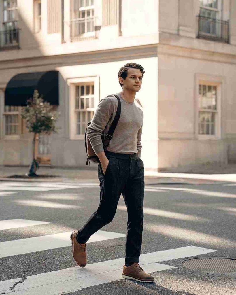 Brown leather shoes lift the outfit so it doesn’t feel too basic. The sweater layer keeps you comfortable, while the trousers keep the shape sharp.