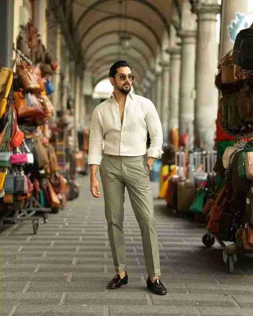 This outfit is strong because it’s simple and balanced. The light shirt feels airy, and the trousers add structure without making you look too formal.