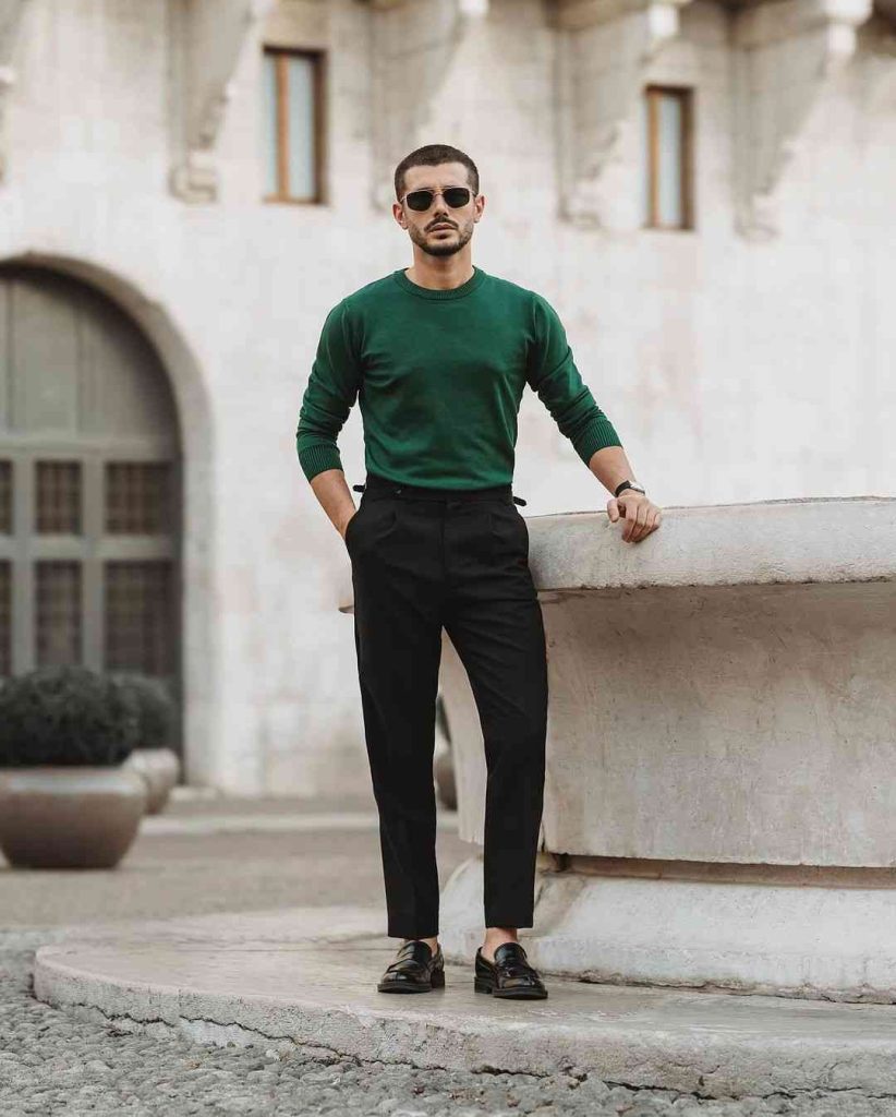 A bold green sweater with black trousers is a smart casual men summer party outfit that stands out in the right way. It’s great for city plans, evening events, or a stylish meet-up with friends.