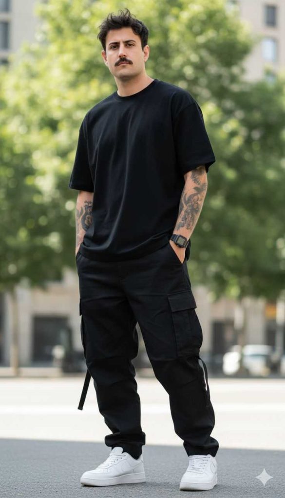 Cargo pants make Streetwear Men Outfits look more rugged and practical. Pair cargos with a simple tee and a lightweight jacket, then add sneakers that match the tone.