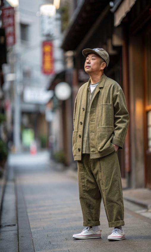 Japanese-style Streetwear Men Outfits lean into workwear and great fabrics. A chore jacket, relaxed pants, and a plain tee can look simple but still stand out.