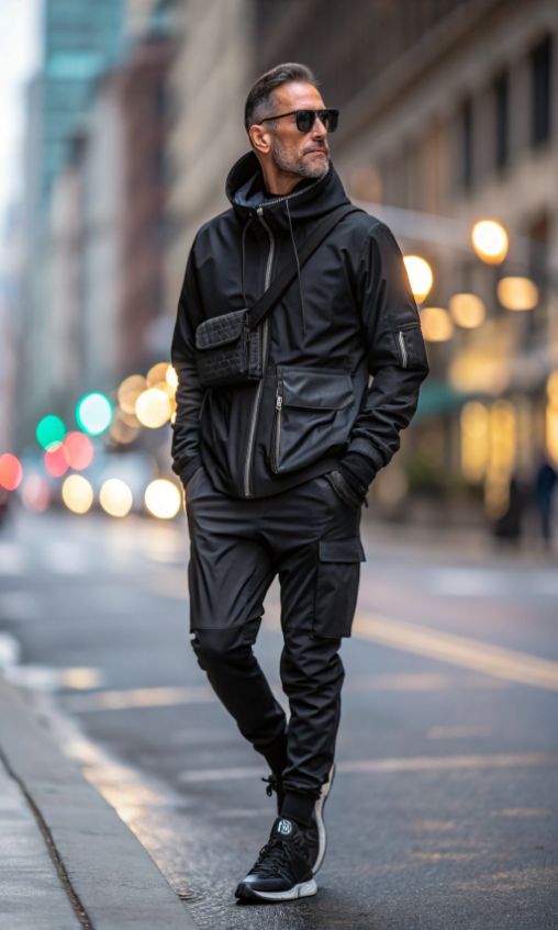 Urban Streetwear Men Outfits usually have a tougher edge. Try a bomber jacket, dark pants, and sneakers with some weight to them for that city feel.