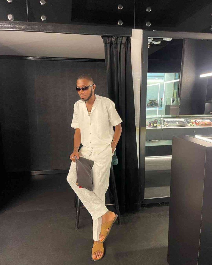 A grey linen button-up with matching linen trousers creates a smooth, high-end monochrome look. Keeping the top slightly open makes it feel relaxed, not stiff.