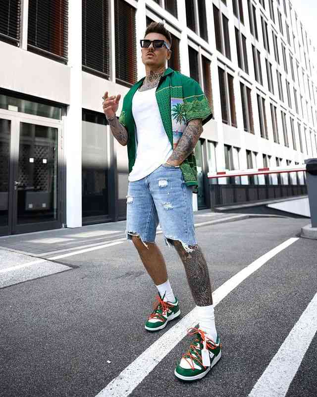 If you like bold fashion, match bright sneakers with a graphic shirt for a strong color story. Distressed denim shorts keep the look grounded and street-ready.