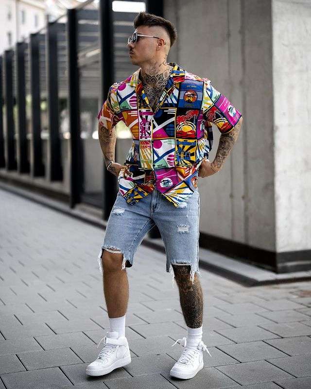 Graphic shirts bring big energy, so it helps when the shorts are simple and rugged. Distressed denim shorts add edge and balance the loud colors up top.
