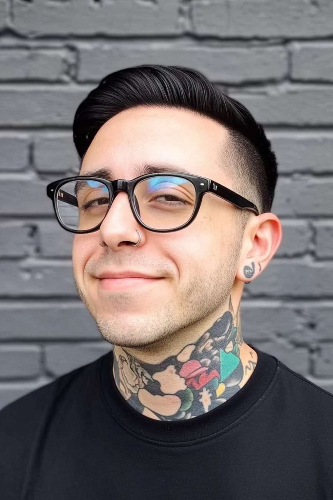 Here, the sides are faded at the temples while the top is combed neatly with a side part. It gives a classic look with a modern touch.