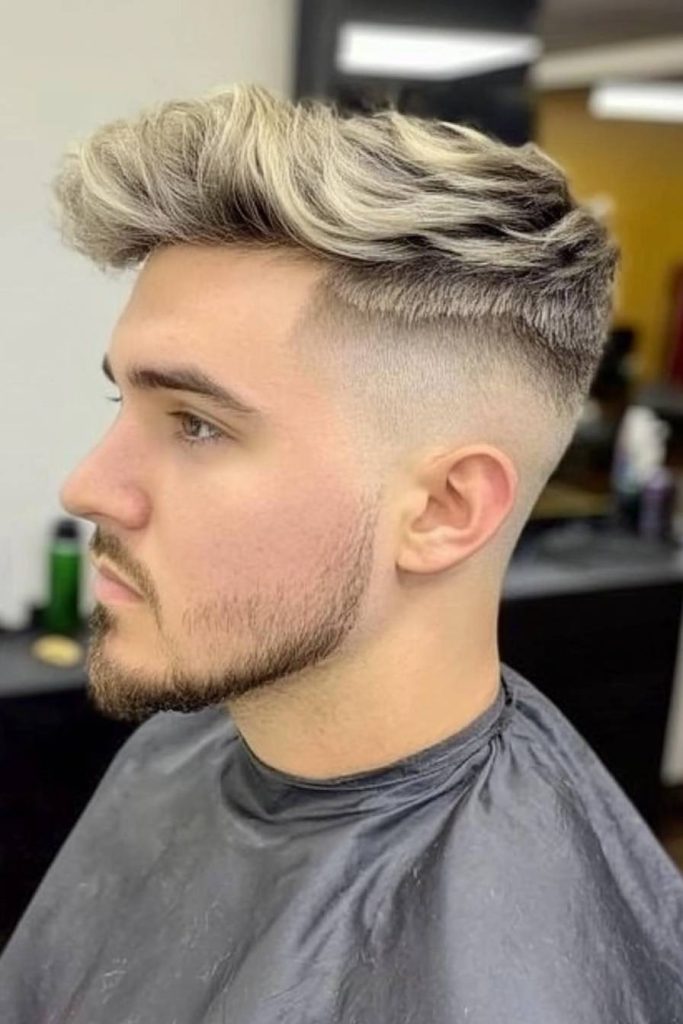 This look mixes bold color with a clean temple fade. The fade helps the blonde waves look more controlled and stylish, not messy.