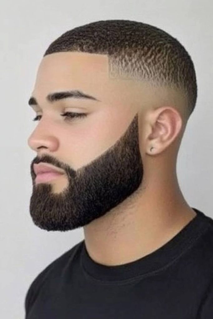 This haircut combines short waves with a beard that fades smoothly into the hair. The clean blend creates a very sharp and groomed appearance.